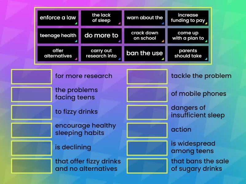 crack down on school - that offer fizzy drinks and no alternatives, offer alternatives - to fizzy drinks, enforce a law - that bans the sale of sugary drinks, teenage health - is declining, do more to - encourage healthy sleeping habits, ban the use - of mobile phones, parents should take - action, warn about the - dangers of insufficient sleep, the lack of sleep - is widespread among teens, increase funding to pay - for more research, come up with a plan to - tackle the problem, carry out research into - the problems facing teens,