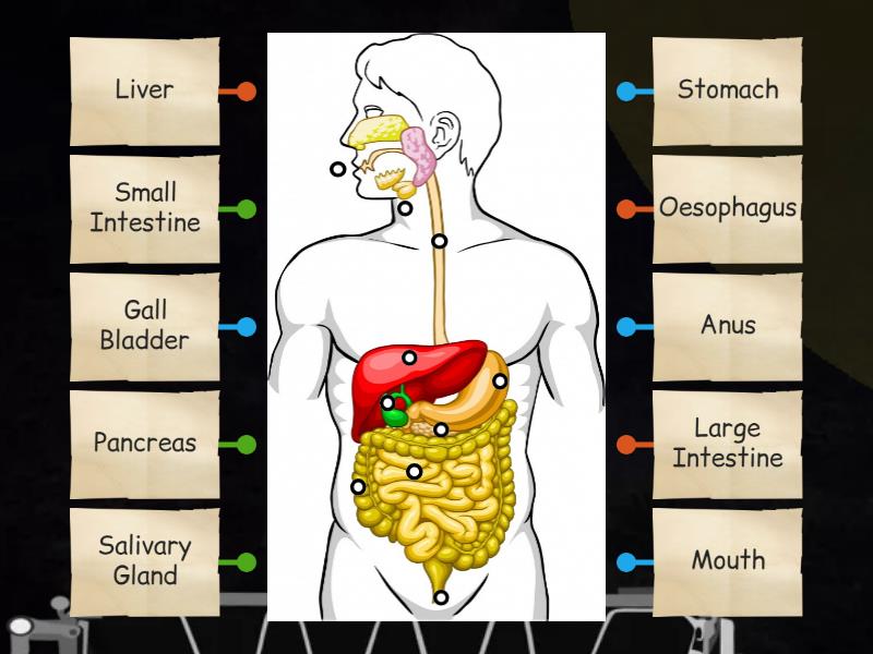 Mouth, Salivary Gland, Oesophagus, Stomach, Small Intestine, Liver, Gall Bladder, Pancreas, Large Intestine, Anus.