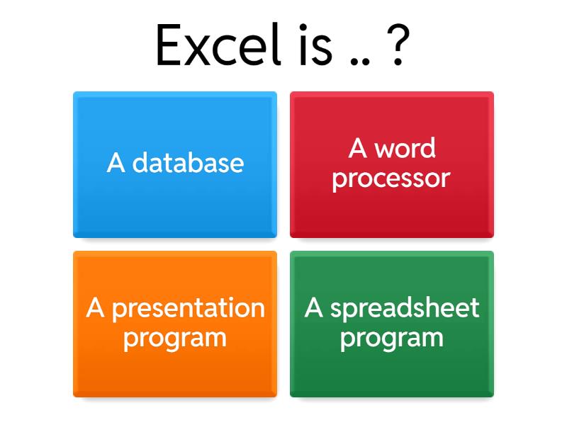 1) Excel is .. ? a) A database b) A word processor  c) A presentation program d) A spreadsheet program 2) A spreadsheet is ... ? a) A program that modifies pictures b) A program that performs mathematical work c) A program that creates text based documents d) A website to watch videos 3) A spreadsheet workbook consists of ? a) Boxes b) Squares c) Cubes d) Cells 4) Which of the following is a correct cell reference (name)? a) %4 b) XX c) 4C d) C4 5) Using _________ in spreadsheets can allow you to quickly make calculations? a) Formulas b) Images c) Charts d) WordArt 6) A formula always starts with? a) - b) = c) * d) / 7) What is the symbol for multiplication on a spreadsheet? a) - b) + c) * d) / 8) What is the symbol for division on a spreadsheet? a) - b) + c) * d) / 9) Which tool is used to colour a cell? a) Shape Fill b) Alignment tool 10) What button can you click on to create a SUM formula? a) CreateSum b) AutoSum c) TotalSum d) Sum 11) What button do you press on the keyboard to absolute a cell? a) F7 b) F4 c) F5 d) 4F 12) What function do you use to find the highest value of a set of data? a) =MIN() b) =SUM() c) =MAX() d) =COUNT() 13) What function do you use to find the smallest value of a set of data? a) =MIN() b) =SUM() c) =MAX() d) =COUNT() 14) What function do you use to find the average of a set of data? a) =MIN() b) =AVERAGE() c) =MAX() d) =COUNT() 15) What does ascending order mean when sorting? a) Z-A b) A-Z 16) What does descending order mean when sorting? a) Z-A b) A-Z 17) How many print outs does an excel task require? a) 3 b) 2 18) What does it mean when you are asked to embed a chart? a) Separate print out for chart. b) Print Chart on a new sheet c) Print chart covering the data on the excel worksheet d) Print chart on the same page of the excel worksheet 19) Chart titles should always be typed in ... a) Sentence case b) Uppercase (ALL CAPS) c) Lowercase 20) Bar/line charts should include a) Data, chart title, legend and axis-titles b) Data, Chart title, Data Labels, Legend 21) Pie charts should include a) Data, chart title, legend and axis-titles b) Data, Chart title, Data Labels, Legend