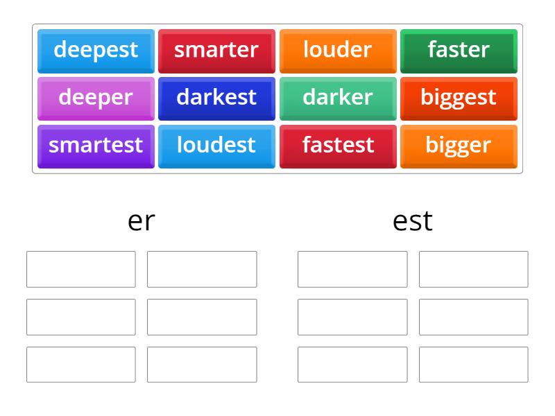 er: darker, deeper, faster, smarter, louder, bigger, est: deepest, darkest, fastest, smartest, loudest, biggest,