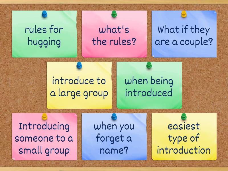 Introducing someone to a small group - introduce to everyone, introduce to a large group - do not introduce to each person just the group, easiest type of introduction - Introducing yourself , when being introduced - stand up, give a handshake, what's the rules? - older people first, family before friends, higher bosses over lower, when you forget a name? - 1. be honest or 2. get them to introduce themselves, What if they are a couple? - Just ask? , rules for hugging - Time, Place, setting, and how well you know them,