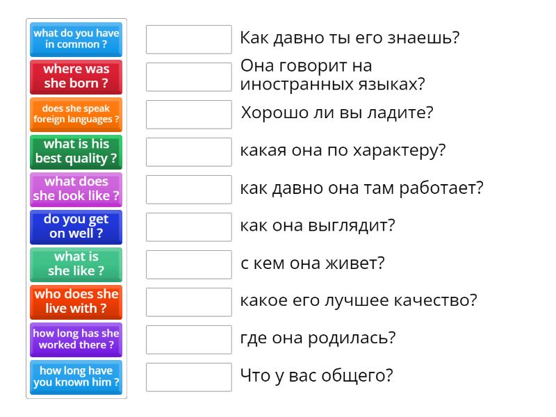 where was she born ? - где она родилась? , who does she live with ? - с кем она живет? , how long has she worked there ? - как давно она там работает? , what does she look like ? - как она выглядит? , what is she like ? - какая она по характеру? , what is his best quality ? - какое его лучшее качество? , does she speak foreign languages ? - Она говорит на иностранных языках?, how long have you known him ? - Как давно ты его знаешь? , what do you have in common ? - Что у вас общего? , do you get on well ? - Хорошо ли вы ладите? ,