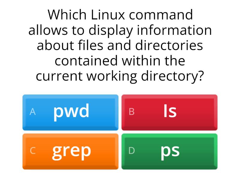 1) Which Linux command allows to display information about files and directories contained within the current working directory? a) pwd b) Is c) grep d) ps 2) A Linux command displaying an absolute path to (i.e., full filename of) the current working directory is called: a) mv b) pwd  c) rm d) di 3) Which Linux command-line command is used for transferring files/directories to a different directory? a) replace b) export c) move d) mv 4)  Which of the Linux commands listed below allows for copying files and directories? a) cp b) copy c) xcopy d) robocopy 5)  A command-line command in Linux used for deleting files and directories is known as: a) erase b) rm  c) del d) edit 6)  What is the function of the Linux chmod command? a) Changes file access permissions b) Changes file owner and group permissions c) Compares the contents of two files or sets of files d) Changes the Linux command prompt 7) What is the function of the Linux chown command? a) Changes the Linux command prompt b) Compares the contents of two files or sets of files c) Changes file owner and group permissions d) Changes file access permissions 8) Which of the following is a Linux command that allows to assume the identity of a different system user and execute commands with security privileges of that user account? a) sync b) id c) usermod d) su 9) A Linux command that temporarily modifies security privileges to allow an execution of a single command that requires root access permissions is called: a) id b) sudo c) usermod d) su