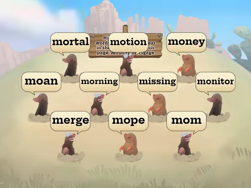 Correct: mortal, money, morning, monitor, mope, monster, Incorrect: motion, moan, missing, merge, mom, mower,