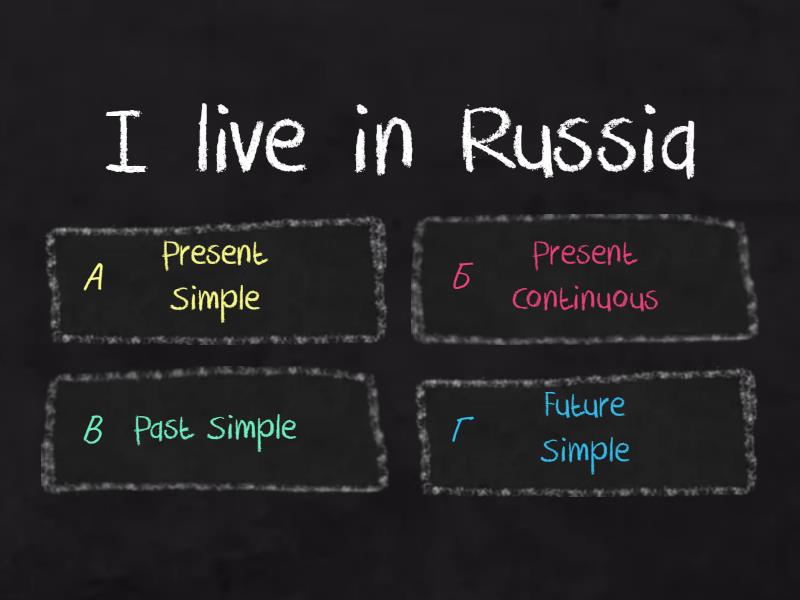 1) I live in Russia a) Present Simple b) Present Continuous c) Past Simple d) Future Simple 2) He is playing the guitar now a) Present Simple b) Present Continuous c) Past Simple d) Future Simple 3) They aren't visiting their grandma tomorrow a) Present Simple b) Present Continuous c) Past Simple d) Future Simple 4) Mum cooked a cake yesterday a) Present Simple b) Present Continuous c) Past Simple d) Future Simple 5) We will move to London next year a) Present Simple b) Present Continuous c) Past Simple d) Future Simple 6) Are you sleeping now? a) Present Simple b) Present Continuous c) Past Simple d) Future Simple 7) Does he have any brothers or sisters? a) Present Simple b) Present Continuous c) Past Simple 8) Will you go to school tomorrow?   a) Future Simple b) Present Continuous c) Past Simple d) Present Simple 9) Daisy went to Egypt last week a) Present Simple b) Present Continuous c) Past Simple d) Future Simple 10) Did he go to the park yesterday? a) Present Simple b) Present Continuous c) Past Simple d) Future Simple 11) Is your dad reading a book at the moment? a) Present Simple b) Present Continuous c) Past Simple d) Future Simple 12) Will she be a doctor?  a) Present Simple b) Present Continuous c) Past Simple d) Future Simple 13) What do you like doing in your freetime? a) Present Simple b) Present Continuous c) Past Simple d) Future Simple 14) He loves reading comics a) Present Simple b) Present Continuous c) Past Simple 15) She isn't tired now a) Present Simple b) Present Continuous c) Past Simple d) Future Simple 16) They aren't listening to music at the moment a) Present Simple b) Present Continuous c) Past Simple d) Future Simple 17) I usually get up at 7 o'clock a) Present Simple b) Present Continuous c) Past Simple d) Future Simple 18) Did you wash a car yesterday? a) Present Simple b) Present Continuous c) Past Simple d) Future Simple