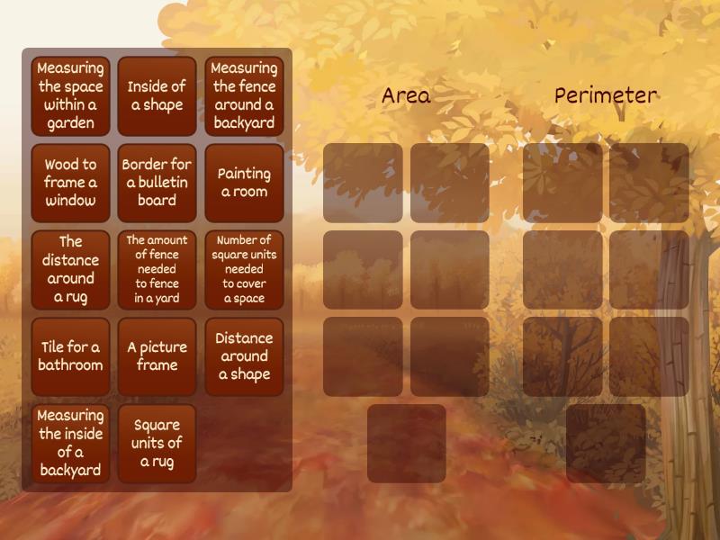 Area: Inside of a shape, Measuring the space within a garden, Measuring the inside of a backyard, Painting a room, Tile for a bathroom, Number of square units needed to cover a space, Square units of a rug, Perimeter: Distance around a shape, Measuring the fence around a backyard, Wood to frame a window, Border for a bulletin board, The distance around a rug, The amount of fence needed to fence in a yard, A picture frame,