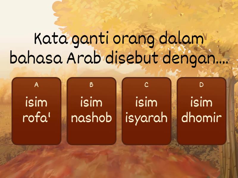 1) Kata ganti orang dalam bahasa Arab disebut dengan.... a) isim rofa' b) isim nashob c) isim isyarah d) isim dhomir 2) Kata ganti orang untuk menunjukkan kepemilikan addalah... a) dhomir muttashil b) dhomir munfashil c) dhomir taqdiri d) dhomir tathbiqi 3) هو bentuk dhomir muttashilnya adalah... a) ه b) ها c) هما d) هن 4) "Buku milik hasan" terjemahan bahasa Arabnya adalah... a) كتابها حسن b) كتابه حسن c) كتابهما حسن d) كتابهم حسن 5) "Pulpen milik Zainab" terjemahan bahasa Arabnya adalah... a) قلمه زينب b) قلمهم زينب c) قلمها زينب d) قلهن زينب