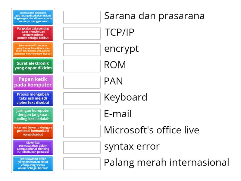 Surat elektronik yang dapat dikirim - E-mail, Papan ketik pada komputer - Keyboard, Mayoritas permasalahan dalam Computational Thinking (CT) dilakukan pada sisi  - Sarana dan prasarana, Pangkalan data penting yang menyimpan sekuens primer protein sebagai berikut - Palang merah internasional , Jenis layanan office yang disediakan cloud computing secara online sebagai berikut -  Microsoft's office live , stand alone debugger gdb jarang disediakan dalam lingkungan visual karena pada umumnya menggunakan   - syntax error, Jenis memori komputer yang hanya bisa dibaca dan telah disediakan oleh pabrik pembuat motherboard disebut - ROM, Jaringan komputer dengan jangkuan paling kecil adalah  - PAN, Proses mengubah teks asli mejadi ciphertext disebut - encrypt, internet bekerja dengan protokol komunikasi yang disebut - TCP/IP,