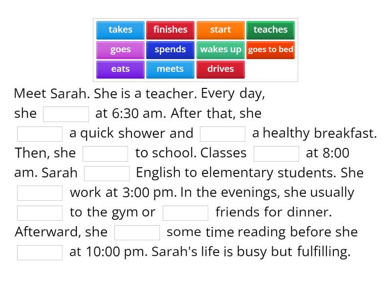 Meet Sarah. She is a teacher. Every day, she ____ at 6:30 am. After that, she ____ a quick shower and ____ a healthy breakfast. Then, she ____ to school. Classes ____ at 8:00 am. Sarah ____ English to elementary students. She ____ work at 3:00 pm. In the evenings, she usually ____ to the gym or ____ friends for dinner. Afterward, she ____ some time reading before she ____ at 10:00 pm. Sarah's life is busy but fulfilling.