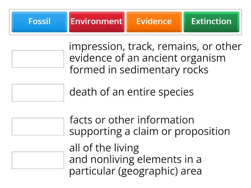 Environment - all of the living and nonliving elements in a particular (geographic) area, Evidence - facts or other information supporting a claim or proposition, Extinction - death of an entire species, Fossil  - impression, track, remains, or other evidence of an ancient organism formed in sedimentary rocks,
