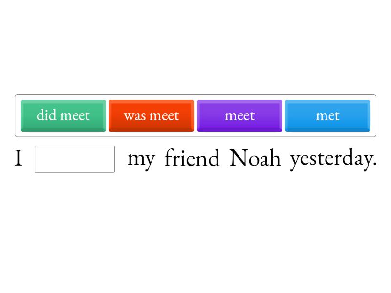 Who ____ you ____ yesterday? I ____ my friend Noah yesterday. Where ____ you yesterday? I ____ at home yesterday. What ____ you ____ for dinner last night? I ____ spaghetti for dinner last night. Who ____ your best friend in high school? My best friend in high school ____ Laura. Where ____ you ____ on vacation last summer? I ____ to Mexico on vacation last summer. What ____ the weather like last weekend? The weather last weekend ____ sunny and warm. When ____ your last vacation? My last vacation ____ in July. When ____ you ____ learning English? I ____ learning English three years ago. How ____ you ____ to the party last weekend? I ____ to the party by taking a taxi. How ____ your weekend? My weekend ____ great, thank you.