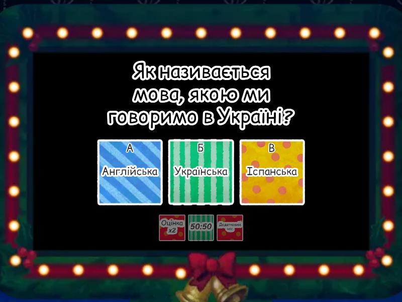 1) Як називається мова, якою ми говоримо в Україні? a) Англійська b) Українська c) Іспанська 2) Скільки літер у нашій абетці? a) 24 b) 33 c) 28 3) Яка літера йде після "г" у абетці? a) Д b) Ж c) І 4) Яка літера йде перед "и" у абетці? a) З b) Ж c) І 5) Яка літера повторюється на початку слова "сонце"? a) Е b) О c) С 6) Яка літера повторюється на початку слова "зима"? a) З b) Я c) М 7) Яка літера повторюється на в кінці слова "вітер"? a) В b) І c) Р