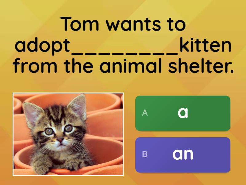 1) Tom wants to adopt________kitten from the animal shelter. a) a b) an 2) Lisa wants to become________successful bussiness woman. a) a b) an 3) There is________old church at the end of the street. a) a b) an 4) She's reading________romantic novel by her favorite author. a) a b) an 5) We need________fresh start after all this trouble.  a) a b) an 6) There is________old bridge over the river. a) a b) an 7) There is________four-leaf clover in the garden. a) a b) an 8) She received________invitation to the wedding. a) a b) an 9) My mother wants to become________professional photographer. a) a b) an 10) We need________break from work. It's time to plan our next vacation. a) a b) an 11) The room has________abstract picture on the wall. I think it's beautiful! a) a b) an 12) There is________empty chair here. You can sit if you want to.   a) a b) an 13) I have________hour before my next meeting. I'm available to talk if you want to. a) a b) an 14) He received________honor medal for his outstanding contributions to the community. a) a b) an 15) I'm reading________fascinating book about space exploration. a) a b) an 16) There is________oak tree in the park, near the river. It's dazzling. a) a b) an