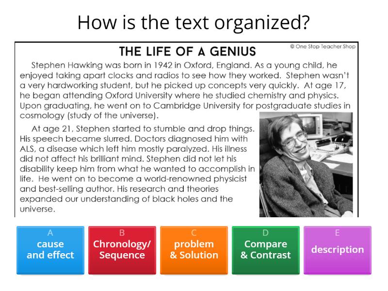 1) How is the text organized? a) cause and effect b) Chronology/ Sequence c) problem & Solution d) Compare & Contrast e) description 2) How is the text organized? a) cause and effect b) Chronology/ Sequence c) problem & Solution d) Compare & Contrast e) description 3) How is the text organized? a) cause and effect b) Chronology/ Sequence c) problem & Solution d) Compare & Contrast e) description 4) How is the text organized? a) cause and effect b) Chronology/ Sequence c) problem & Solution d) Compare & Contrast e) description 5) How is the text organized? a) cause and effect b) Chronology/ Sequence c) problem & Solution d) Compare & Contrast e) description 6) How is the text organized? a) cause and effect b) Chronology/ Sequence c) problem & Solution d) Compare & Contrast e) description 7) How is the text organized? a) cause and effect b) Chronology/ Sequence c) problem & Solution d) Compare & Contrast e) description 8) How is the text organized? a) cause and effect b) Chronology/ Sequence c) problem & Solution d) Compare & Contrast e) description 9) How is the text organized? a) cause and effect b) Chronology/ Sequence c) problem & Solution d) Compare & Contrast e) description 10) How is the text organized? a) cause and effect b) Chronology/ Sequence c) problem & Solution d) Compare & Contrast e) description 11) How is the text organized? a) cause and effect b) Chronology/ Sequence c) problem & Solution d) Compare & Contrast e) description 12) How is the text organized? a) cause and effect b) Chronology/ Sequence c) problem & Solution d) Compare & Contrast e) description 13) How is the text organized? a) cause and effect b) Chronology/ Sequence c) problem & Solution d) Compare & Contrast e) description 14) How is the text organized? a) cause and effect b) Chronology/ Sequence c) problem & Solution d) Compare & Contrast e) description 15) How is the text organized? a) cause and effect b) Chronology/ Sequence c) problem & Solution d) Compare & Contrast e) description