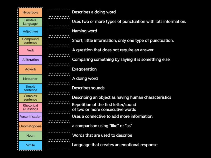 Alliteration - Repetition of the first letter/sound of two or more consecutive words, Hyperbole - Exaggeration, Rhetorical Questions - A question that does not require an answer, Simile - a comparison using "like" or "as", Emotive Language - Language that creates an emotional response, Adjectives - Words that are used to describe, Compound sentence - Uses a connective to add more information., Adverb - Describes a doing word, Simple sentence - Short, little information, only one type of punctuation., Noun - Naming word, Metaphor - Comparing something by saying it is something else, Complex sentence - Uses two or more types of punctuation with lots information., Verb - A doing word, Onomatopoeia - Describes sounds, Personification - Describing an object as having human characteristics,