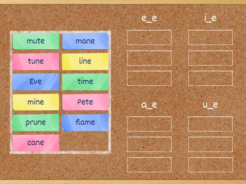 e_e: Pete, Eve, i_e: mine, time, line, a_e: mane, flame, cane, u_e: prune, tune, mute,