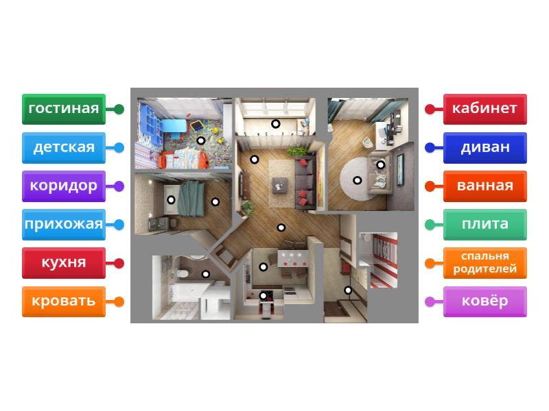детская, кухня, спальня родителей, гостиная , ковёр, диван, плита, ванная, коридор, прихожая, кабинет, кровать.