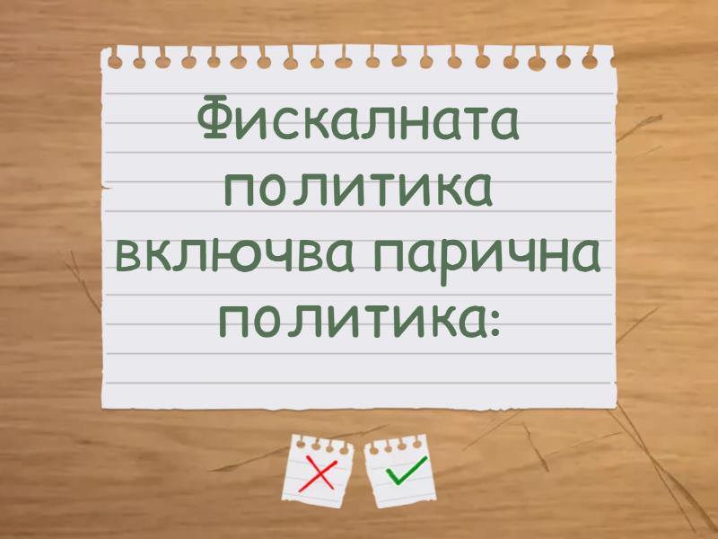 Човекът може да бъде едновременно обект и субект на икономиката., Да участваш в икономиката означава да произвеждаш и потребяваш ресурси, стоки и услуги., Ако корпоративният данък се намали на 9%, това няма да се отрази на данъчния размер:, Фискалната макроикономическа политика се основава на принципите на монетаризма:, Пропорционалното данъчно облагане е фиксиран данък:, Увеличаването на данъчното облагане е вид рестриктивна едностранна данъчна политика, Бюджетната политика може да бъде експанзионистична:, Фискалната политика включва парична политика:, Елемент на автоматичните стабилизатори са прогресивното облагане на корпоративната печалба:, Идеята, че бюджетния дефицит не винаги е във вреда на икономиката първа се лансира от класическата школа,
