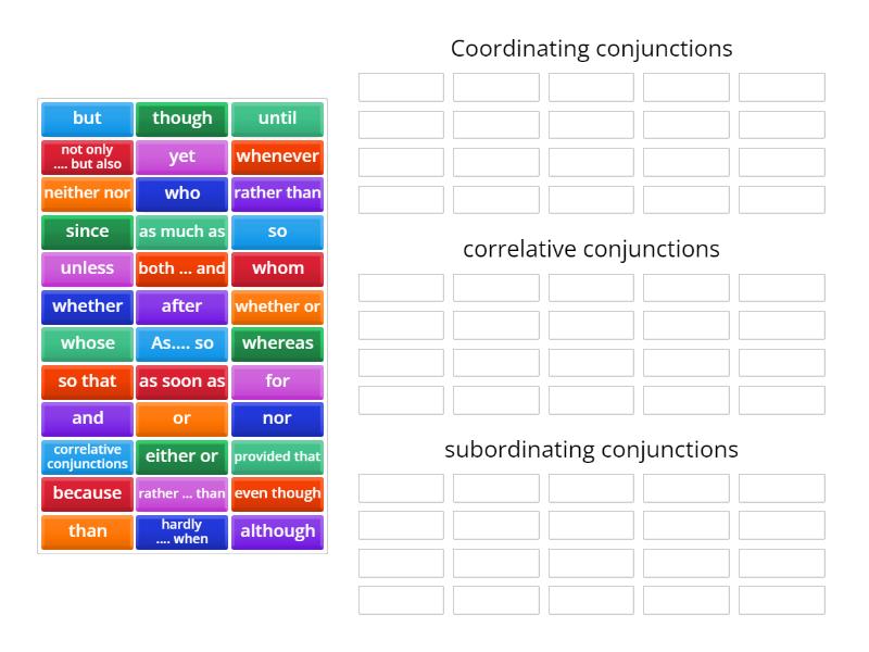 Coordinating conjunctions : for , and , nor, but, or, yet, so, correlative conjunctions : correlative conjunctions , both ... and , either or , neither nor , whether or , not only .... but also , hardly .... when , rather ... than , As.... so , subordinating conjunctions : than, rather than , whether , as much as , whereas, after , as soon as , until , whenever, though, although , even though , who, provided that , whom , unless, whose, because, since, so that,