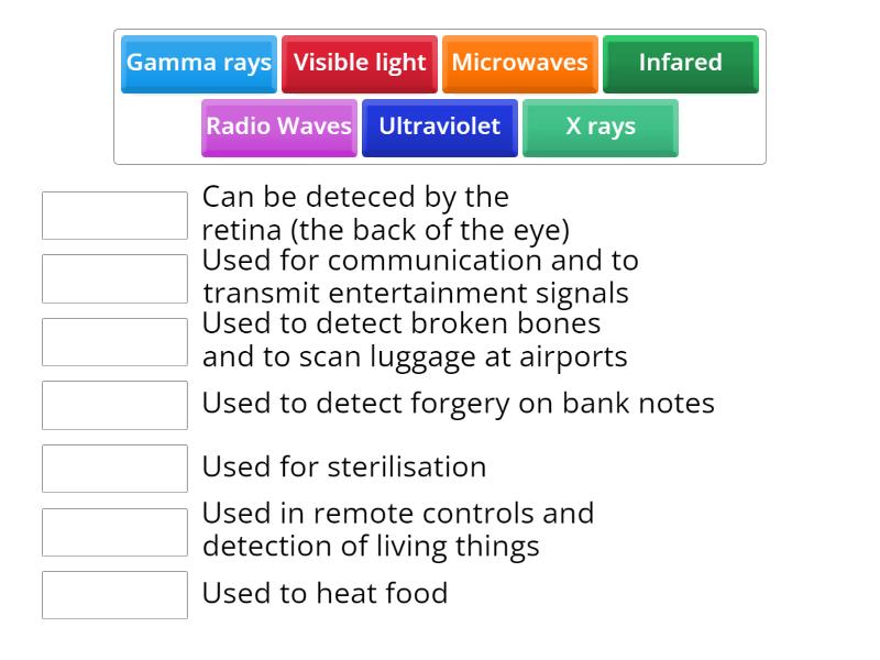 Radio Waves - Used for communication and to transmit entertainment signals , Microwaves - Used to heat food , Infared - Used in remote controls and detection of living things , Visible light - Can be deteced by the retina (the back of the eye), Ultraviolet - Used to detect forgery on bank notes, X rays - Used to detect broken bones and to scan luggage at airports , Gamma rays - Used for sterilisation ,