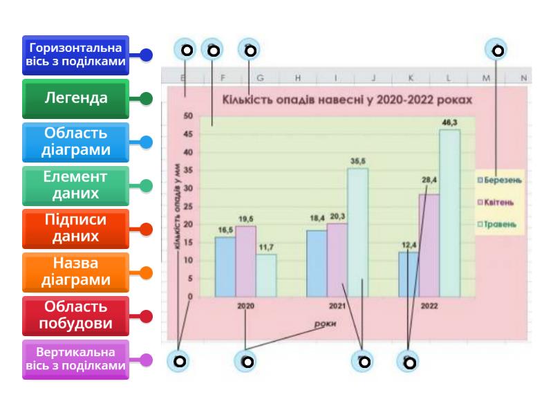 Область діаграми, Область побудови, Назва діаграми, Легенда, Вертикальна вісь з поділками, Горизонтальна вісь з поділками, Елемент даних, Підписи даних.