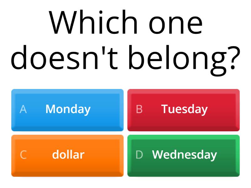 1) Which one doesn't belong? a) Monday b) Tuesday c) dollar d) Wednesday 2) Which one does't belong? a) Seventy-five b) Twenty-two c) credit card d) Thirty 3) Which one doesn't belong? a) orange b) credit card c) passport d) wallet 4) Which one doesn't belong? a) Japanese b) Brazil c) Chilean d) Saudi 5) Which one doesn't belong? a) board b) desk c) chair d) car 6) Which one doesn't belong? a) watch b) ID Card c) key d) truck 7) Which one doesn't belong? a) Can I take your order? b) open books c) how do you spell that? d) close books