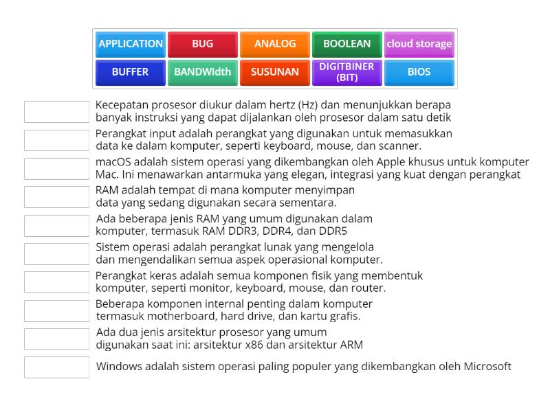 ANALOG - Ada dua jenis arsitektur prosesor yang umum digunakan saat ini: arsitektur x86 dan arsitektur ARM, APPLICATION - Kecepatan prosesor diukur dalam hertz (Hz) dan menunjukkan berapa banyak instruksi yang dapat dijalankan oleh prosesor dalam satu detik, SUSUNAN - RAM adalah tempat di mana komputer menyimpan data yang sedang digunakan secara sementara., BANDWIdth - Ada beberapa jenis RAM yang umum digunakan dalam komputer, termasuk RAM DDR3, DDR4, dan DDR5, DIGITBINER (BIT) - Perangkat keras adalah semua komponen fisik yang membentuk komputer, seperti monitor, keyboard, mouse, dan router., BIOS - Perangkat input adalah perangkat yang digunakan untuk memasukkan data ke dalam komputer, seperti keyboard, mouse, dan scanner., BOOLEAN - Beberapa komponen internal penting dalam komputer termasuk motherboard, hard drive, dan kartu grafis., BUFFER - Sistem operasi adalah perangkat lunak yang mengelola dan mengendalikan semua aspek operasional komputer., BUG - Windows adalah sistem operasi paling populer yang dikembangkan oleh Microsoft, cloud storage - macOS adalah sistem operasi yang dikembangkan oleh Apple khusus untuk komputer Mac. Ini menawarkan antarmuka yang elegan, integrasi yang kuat dengan perangkat,