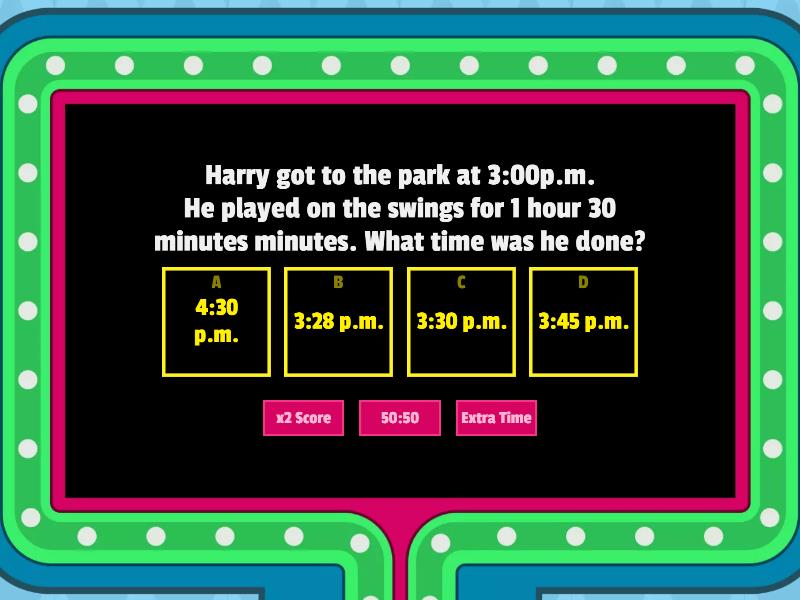 1) Harry got to the park at 3:00p.m. He played on the swings for 1 hour 30 minutes minutes. What time was he done? a) 4:30 p.m. b) 3:28 p.m. c) 3:30 p.m. d) 3:45 p.m. 2) James got to school at 8:30. He stopped at his locker for 15 minutes and worked on iReady for 15 minutes. What time was he done? a) 8:51 b) 8:20 c) 9:30 d) 9:00 3) Mary got reading class at 11:15. She read a book for 15 minutes and wrote for 30 minutes. What time was she done? a) 11:41 b) 11:45 c) 11:33 d) 11:52 4) Sarah went to bed at 10:00. She woke up 11:30. How lone did she sleep a) 1 hour and 30 minutes b) 38 minutes c) 23 minutes d) 1 hour and 15 minutes 5) Steve got to work at 12:00. He worked for 3 hours. What time was he done a) 1:15 b) 1:20 c) 3:00 d) 2:00 6) Pam needs to be at work by 4:00. It takes her 1 hour to get there. What time should she leave? a) 3:00 b) 5:00 c) 2:30 d) 4:00 7) Jake picked apples at 5:30. He stayed for 1 1/2 hours. What time did he leave? a) 6:30 b) 7:00 c) 5:30 d) 7:30 8) Mark needs to go to bed at 10:00pm. It takes him 1 hour 30 minutes to get ready for bed. What time should he start to get ready? a) 9:00 b) 9:30 c) 8:00 d) 8:30 9) Joe will catch the bus at 4:30. It takes him 30 minutes to walk to the bus stop. What time should he start walking? a) 4:00 b) 3:45 c) 3:00 d) 4:15 10) Sue will put a pizza in the oven at 5:15. It needs to bake for 30 minutes. What time should she take it out of the oven? a) 6:00 b) 5:45 c) 4:30 d) 5:50