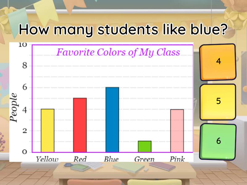 1) How many students like pink? a) 4 b) 5 c) 6 2) How many students like blue? a) 4 b) 5 c) 6 3) What color do students like more? a) blue b) green c) red 4) How many students like red and yellow? a) 7 b) 9 c) 8 5) How many students like green and blue? a) 7 b) 9 c) 8 6) How many more students like blue than pink? a) 3 b) 1 c) 2 7) How many more students like yellow than green? a) 3 b) 1 c) 2