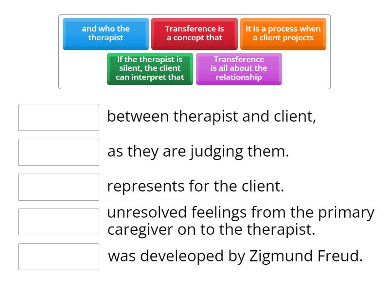 Transference is a concept that - was develeoped by Zigmund Freud., It is a process when a client projects - unresolved feelings from the primary caregiver on to the therapist. , If the therapist is silent, the client can interpret that - as they are judging them., Transference is all about the relationship - between therapist and client,, and who the therapist - represents for the client.,