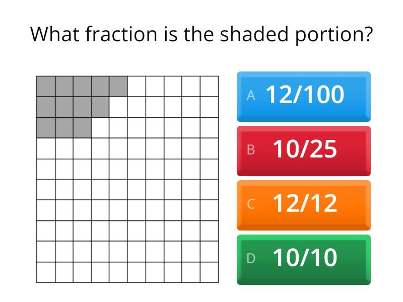 1) What fraction is the shaded portion? a) 12/100 b) 10/25 c) 12/12 d) 10/10 2) Which is the correct illustration for 7/10? a) b) c) d) 3) Which illustration shows 27/50 ? a) b) c) d) 4) Which is fraction shows the shaded portion of the illustration? a) 6/6 b) 6/24 c) 6/20 d) 24/6 5) What fraction is the shaded portion? a) 81/50 b) 81/31 c) 31/81 d) 50/81 6) What is the equivalent of 48/100 in decimal form? a) 0.48 b) 0.048 c) 0.408 d) 00.048 7) What fraction is illustrated by the iphone logo? a) 24/100 b) 24/24 c) 48/14 d) 24/10 8) What fraction is illustrated by the musical notes (♫)? a) 15/15 b) 16/100 c) 15/100 d) 14/100 9) What fraction is represented by the smileys (☺)? a) 5/5 b) 95/100 c) 5/10 d) 5/100 10) What percent is the diamond (♦) in the figure? a) 12% b) 11% c) 10% d) 8%