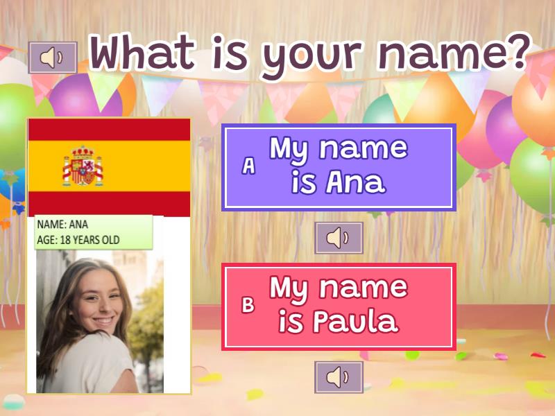 1) What is your name? a) My name is Ana b) My name is Paula 2) How old are you? a) I am 10 years old b) I am 18 years old 3) Where are you from a) I am from Spain. I am Spanish b) I am from Mexico. I am Mexican 4) What is your name? a) My name is Messi b) My name is Cristiano 5) Where are you from? a) I am from Argentina. I am Argentinean b) I am from Ecuador. I am Ecuadorian 6) How old are you? a) I am 36 years old b) I am 46 years old 7) What is your name? a) My name is Carol b) My name is Billie 8) Where are you from? a) I am from U.S.A. I am American b) I am from Canada. I am Canadian 9) How old are you? a) I am 12 years old b) I am 22 years old