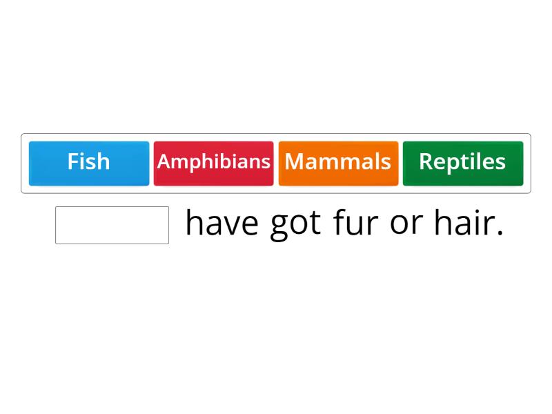 ____ have got fur or hair. ____ have got thick skin and scales. People are ____. Some ____ have got a shell. Frogs are ____. All ____ have got fins and a tail. ____ drink their mother's milk. Most ____ have got scales and teeth. ____ can live on land and in water. ____ have got a beak and feathers. Most ____ lay eggs in water.