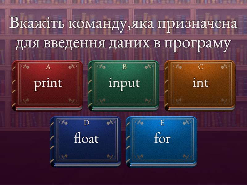 1) Вкажіть команду,яка призначена для введення даних в програму a) print b) input c) int d) float e) for 2) Укажіть змінну, яка опрацьовує цілі числа a) float b) int c) sqrt d) input e) bool f) print 3) Вкажіть оператор, який відповідає за піднесення до степеня в середовищі програмування Python a) ** b) ^ c) // d) % e) \ f) * 4) Присвоєння у мові програмування Python називають знак? a) : b) == c) - d) = e) // 5) До якого типу даних належить запис 4.7 a) float b) int c) bool 6) Яке ключове слово позначає цикл з наперед відомою кількістю повторень? a) print b) for c) repeat d) while 7) Який результат виконання команди: print("3+4") a) "3+4" b) 3+4 c) 7 d) 12 e) '' 8) Вкажіть оператор, який знаходить остачу при діленні в середовищі Python a) == b) // c) % d) / 9) Вкажіть оператор, який знаходить цілу частину при діленні в середовищі Python a) / b) str c) % d) //