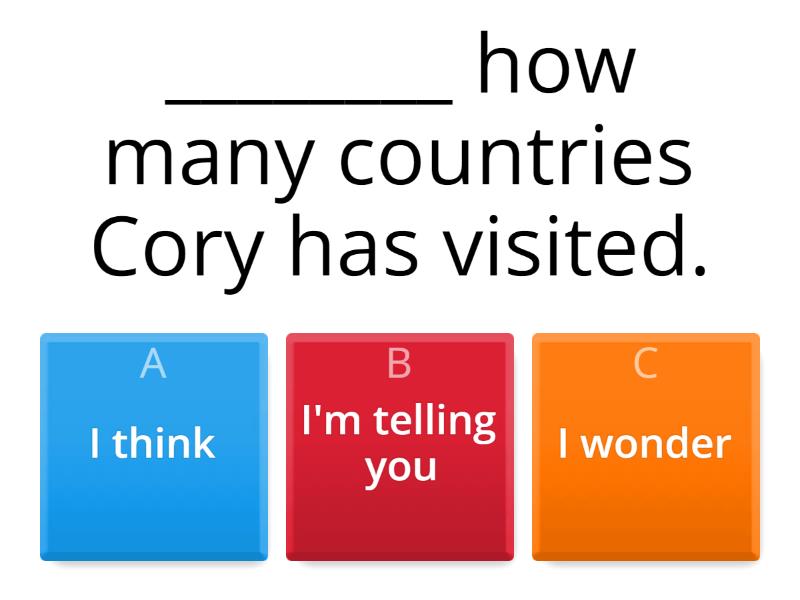 1) ________ how many countries Cory has visited. a) I think b) I'm telling you c) I wonder 2) ____________ you to wear your wrist guards when you go skateboarding. a) I'm telling b) I'm asking c) I'm guessing 3) Do you know / How many medals has Amy Purdy won?  a) Do you know how many medals Amy Purdy win? b) Do you know how many medals Amy Purdy has won? c) Do you know if how many medals has Amy Purdy won? 4) Buy the right equipment for skiing. a) I'm telling you buy the right equipment for skiing. b) I'm telling you to buy the right equipment for skiing. c) I'm telling you if you buy the right equipment for skiing. 5) How do they get to the top of that mountain? a) They are not sure how they get to the top of the mountain. b) They are not sure if they get to the top of the mountain. c) They are not sure how do they get to the top of the mountain. 6) Nontraditional sports are becoming popular. a) I think nontraditional sports are becoming popular. b) I think if nontraditional sports are becoming popular. c) I think how nontraditional sports are becoming popular. 7) I would like to know ____________________ a) I would like to know if you feel when you represent your country. b) I would like to know how do you feel when you represent your country. c) I would like to know how you feel when you represent your country. 8) I'm curious to find out ______________ a) I'm curious to find out what do you do to overcome obstacles. b) I'm curious to find out what you do to overcome obstacles. c) I'm curious to find out to you do to overcome obstacles. 9) I wonder / How difficult is to skate? a) I wonder how difficult to skate is. b) I wonder if how difficult to skate. c) I wonder how difficult is to skate. 10) I'm asking / When is the next marathon? a) I'm asking you when is the next marathon. b) I'm asking you if is the next marathon. c) I'm asking you when the next marathon is.