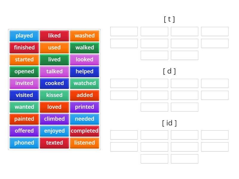[ t ]: looked, watched, talked, cooked, helped, walked, finished, liked, kissed, washed, [ d ]: opened, climbed, played, listened, phoned, enjoyed, used, lived, offered, loved, [ id ]: started, painted, visited, added, texted, completed, invited, wanted, printed, needed,