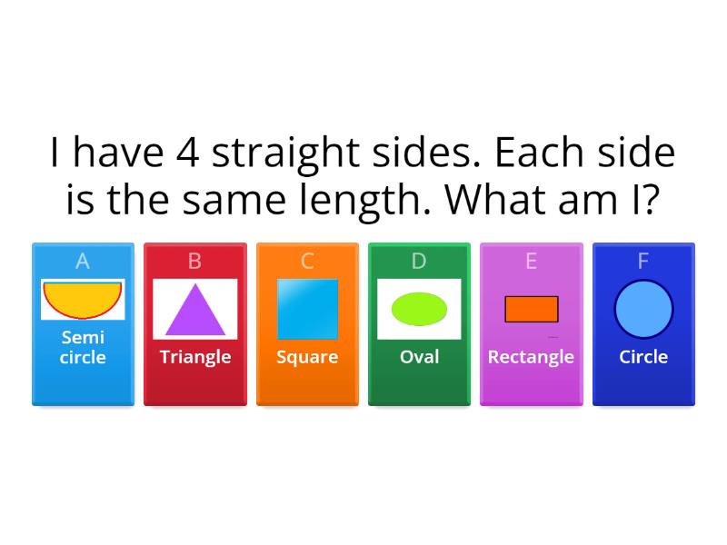1) I have 4 straight sides. Each side is the same length. What am I? a) Semi circle b) Triangle c) Square d) Oval e) Rectangle f) Circle 2) I have one curved side. I have no corners. What am shape am I? a) Circle b) Rectangle c) Semi circle d) Oval e) square f) Triangle 3) I have 2 sides. One is curved and the other is straight. What shape am I? a) Circle  b) Rectangle c) Triangle  d) Square e) Oval f) Semi Circle  4) I have 4 straight sides. Two sides are short and two sides are long. What shape am I? a) Circle b) Rectangle c) Triangle d) Square e) Oval f) Semi Circle 5) I am a 2D shape. I have 3 straight sides. I have 3 corners. What shape am I? a) Triangle b) Semi Circle c) Square d) Rectangle e) Oval f) Circle 6) I have 1 curved sized. I look like a stretched circle. What shape am I? a) Semi Circle b) Oval c) Rectangle d) Circle e) Square f) Triangle