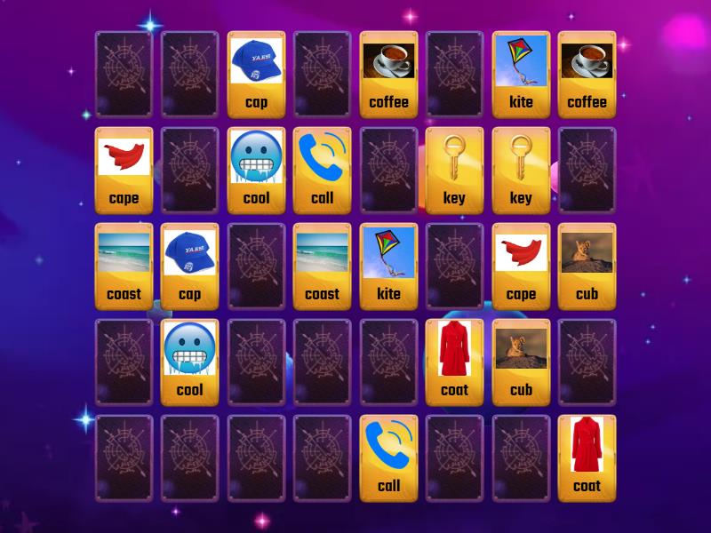 key, cub, cap, call, cool, cape, coast, kite, coat, coffee, go, gown, gate, gust, guide, gig, goat, good, ghost, gal,
