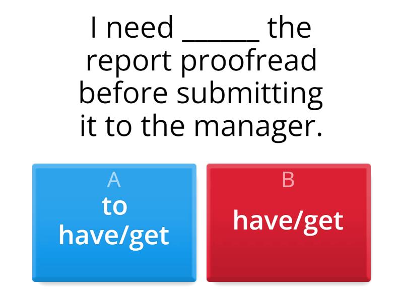 1) I need ______ the report proofread before submitting it to the manager. a) to have/get b) have/get 2) Let's _______ by the finance department. a) process b) get the invoices processed 3) We should ________ by the end of the week. a) have the products shipped b) have the products ship 4) The manager got the project timeline _____ to reflect the new deadline. a) updated b) update 5) Let's _________ by the senior executives. a) have the proposals reviewed b) review 6) The boss needs to get the training materials printed for the upcoming workshop! a) needs to get b) need to gets