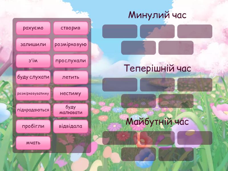 Минулий час: створив, пробігли, залишили, відвідала, прослухали, Теперішній час: летить, розмірковую, рахуємо, підкрадаються, мчать, Майбутній час: буду малювати, з'їм, розмірковуватиму, нестиму, буду слухати,