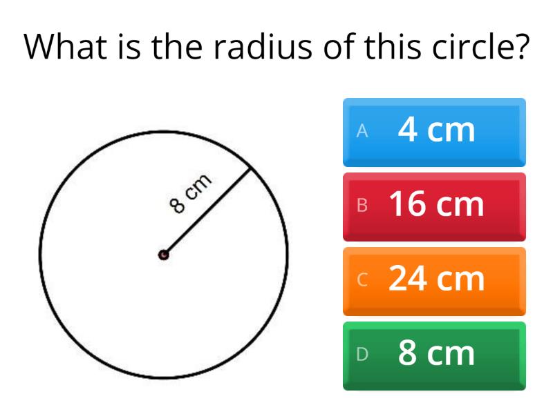 1) What is the radius of this circle? a) 4 cm b) 16 cm c) 24 cm d) 8 cm 2) The diameter of a circle is ________ a) Radius b) 4 X Radius c) 2 X Radius d) Half of a Radius 3) By which we can make a circle? a) Bangle b) Duster c) Eraser d) Book 4) Diameter always passes through the _________ a) Edges b) Radius c) Centre d) Chord 5) What is the diameter of this circle? a) 7 cm b) 14 cm c) 21cm d) 3.5 cm 6) In the figure, what is 'O'? a) Circumference b) Radius c) Centre d) Diameter 7) What is the diameter of this circle? a) 5 cm b) 10 cm c) 25 cm d) 22 mm 8) What is the diameter of this circle? a) 14 yard b) 21 yard c) 3.5 yard d) 7 yard