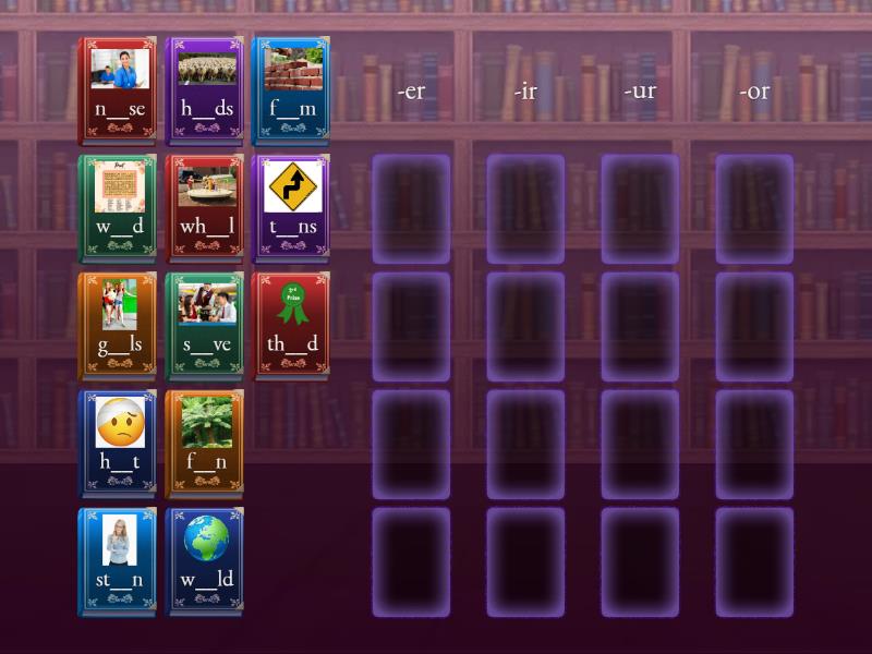 -er : f__n, h__ds, st__n, s__ve, -ir: wh__l, th__d, g__ls, f__m, -ur: h__t, n__se, t__ns, -or: w__ld, w__d,