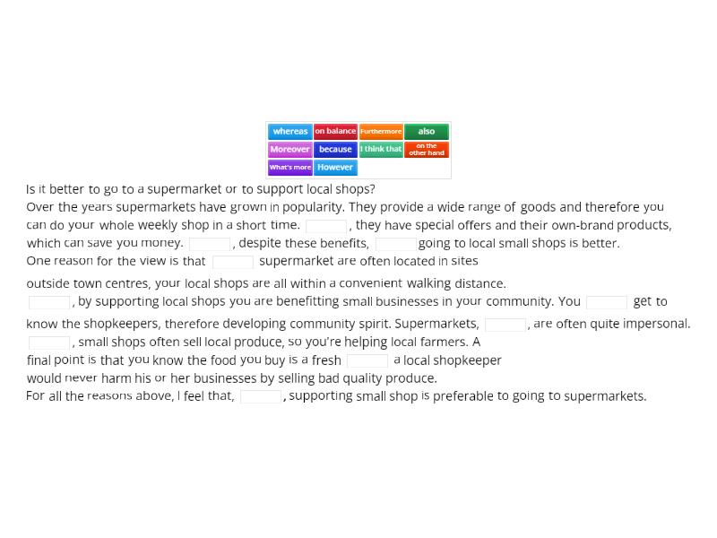 Is it better to go to a supermarket or to support local shops? Over the years supermarkets have grown in popularity. They provide a wide range of goods and therefore you can do your whole weekly shop in a short time. ____, they have special offers and their own-brand products, which can save you money. ____, despite these benefits, ____going to local small shops is better. One reason for the view is that ____ supermarket are often located in sites outside town centres, your local shops are all within a convenient walking distance. ____, by supporting local shops you are benefitting small businesses in your community. You ____ get to know the shopkeepers, therefore developing community spirit. Supermarkets, ____, are often quite impersonal. ____, small shops often sell local produce, so you're helping local farmers. A final point is that you know the food you buy is a fresh ____ a local shopkeeper would never harm his or her businesses by selling bad quality produce. For all the reasons above, I feel that, ____, supporting small shop is preferable to going to supermarkets.
