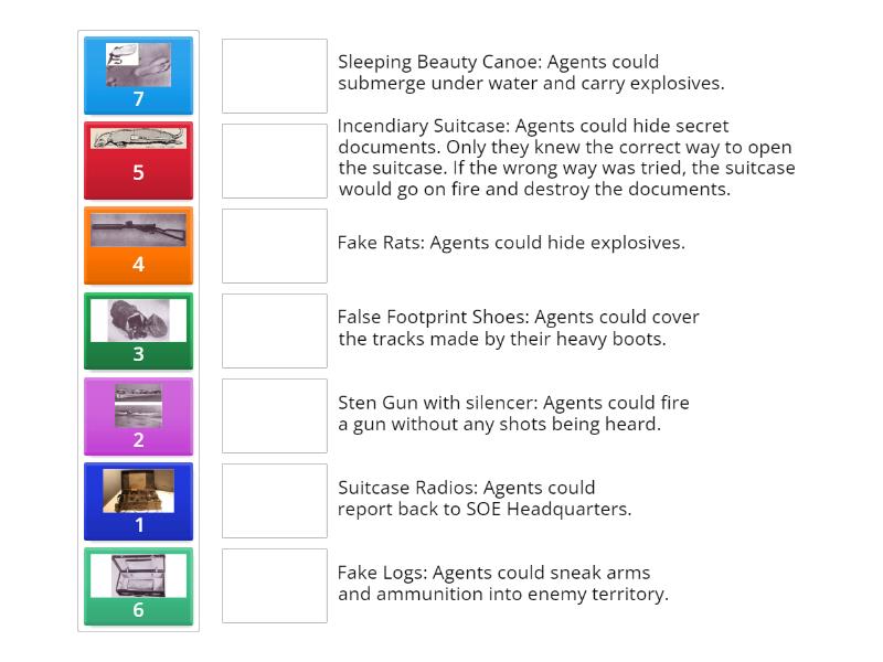 1 - Suitcase Radios: Agents could report back to SOE Headquarters., 2 - Sleeping Beauty Canoe: Agents could submerge under water and carry explosives. , 3 - Fake Logs: Agents could sneak arms and ammunition into enemy territory., 4 - Sten Gun with silencer: Agents could fire a gun without any shots being heard., 5 - Fake Rats: Agents could hide explosives., 6 - Incendiary Suitcase: Agents could hide secret documents. Only they knew the correct way to open the suitcase. If the wrong way was tried, the suitcase would go on fire and destroy the documents., 7 - False Footprint Shoes: Agents could cover the tracks made by their heavy boots.,