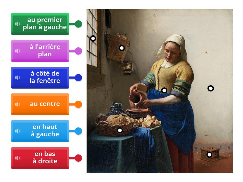 en haut à gauche, en bas à droite, au centre , au premier plan à gauche, à l'arrière plan, à côté de la fenêtre .