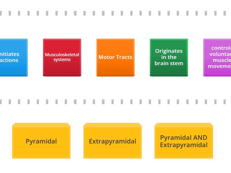 Pyramidal: Include the corticospinal tracts, originate in the cerebral cortex, passes through the medullary pyramids, controls voluntary muscle movement, finalizes actions, direct link to spinal cord, Extrapyramidal: Outside the pyramidal system, Originates in the brain stem, controls involuntary muscle movement, initiates actions, uses motor structures and spinal cord tracts that do not use the pyramids, controls movement related to muscle tone, Pyramidal AND Extrapyramidal: Part of the UMN system, Motor Tracts, Musculoskeletal systems,