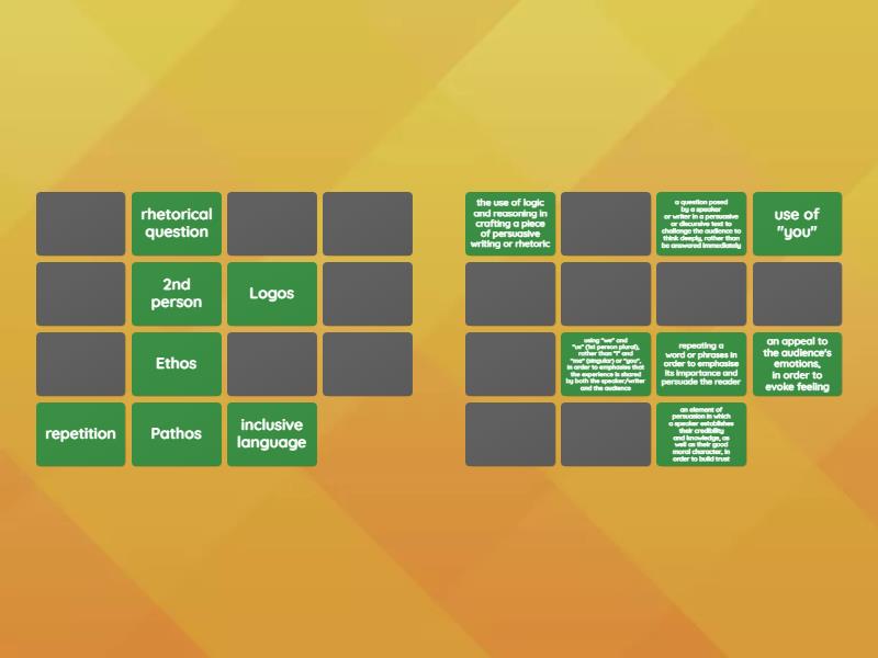Pathos - an appeal to the audience's emotions, in order to evoke feeling, Logos - the use of logic and reasoning in crafting a piece of persuasive writing or rhetoric, Ethos - an element of persuasion in which a speaker establishes their credibility and knowledge, as well as their good moral character, in order to build trust, repetition - repeating a word or phrases in order to emphasise its importance and persuade the reader, inclusive language - using "we" and "us" (1st person plural), rather than "I" and "me" (singular) or "you", in order to emphasise that the experience is shared by both the speaker/writer and the audience, rhetorical question - a question posed by a speaker or writer in a persuasive or discursive text to challenge the audience to think deeply, rather than be answered immediately, 2nd person - use of "you" , 1st person singular - use of "I" and "me" , 3rd person - use of he/she (singular) or they/them (plural), colloquial expressions/ idiom - commonly used everyday expressions which wouldn't usually feature in formal written English, but may be used in persuasive speech by a speaker to identify with the audience eg "tradies", "rolled up their sleeves", pun - playfully using a double-meaning of a particular word such as "My Maths teacher said I was average. She's so mean!", anecdote - personal story from the speaker/writer's own life, references/ allusions - references to historical experiences/ events or to other literary texts, exaggeration - overstating something to make it seem worse or better than it really, cultural knowledge - assumed knowledge which draws on shared cultural background and experience,