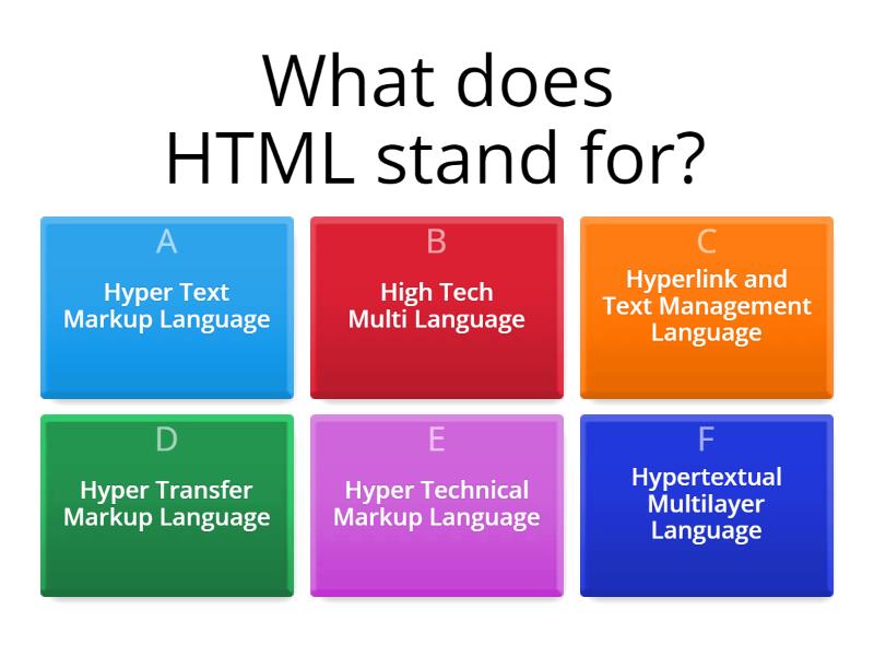 1) What does HTML stand for? a) Hyper Text Markup Language b) High Tech Multi Language c) Hyperlink and Text Management Language d) Hyper Transfer Markup Language e) Hyper Technical Markup Language f) Hypertextual Multilayer Language 2) Which HTML tag is used to create a hyperlink? a) <link> b) <a> c) <hlink> d) <hyper> e) <anchor> f) <url> 3) What is the correct HTML tag for inserting a line break? a) <lb> b) <break> c) <br> d) <line> e) <newline> f) <row> 4) In HTML, what does the acronym "URL" stand for? a) Universal Resource Locator b) Uniform Resource Locator c) Universal Reference Locator d) Uniform Reference Locator e) Unified Resource Locator f) Unitary Reference Locator 5) Which HTML element is used to define the structure of an HTML document, including the document's title and metadata? a) head b) meta c) title d) structure e) document f) description 6) What is the purpose of the HTML <meta charset="UTF-8"> tag? a) Sets the document title b) Defines a character set for the document c) Creates a meta description d) Specifies the document language e) Establishes the document theme f) Declares the document author 7) Which HTML tag is used to create an ordered list? a) ul b) list c) ol d) order e) numeric-list f) sequence 8) What is the correct way to comment out multiple lines in HTML? a) <!-- This is a comment --> b) /* This is a comment */ c) # This is a comment # d) // This is a comment e) -- This is a comment -- f) @@ This is a comment @@ 9) Which HTML tag is used to create a hyperlink to an email address? a) <mailto> b) <email> c) <a href="mailto:..."> d) <link email> e) <message> f) <communication> 10) What does the HTML attribute target="_blank" do when used with the <a> (anchor) element? a) It opens the link in a new tab or window b) It specifies a specific target for the link c) It sets the link to open in the same tab d) It defines the colour of the link e) It disables the link f) It changes the font of the link text