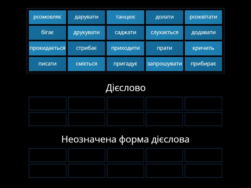 Дієслово : бігає , стрибає, кричить, слухається , розмовляє, прокидається , пригадує, прибирає, танцює, сміється , Неозначена форма дієслова: писати, друкувати, саджати, розквітати, долати, прати, додавати, дарувати, приходити, запрошувати,