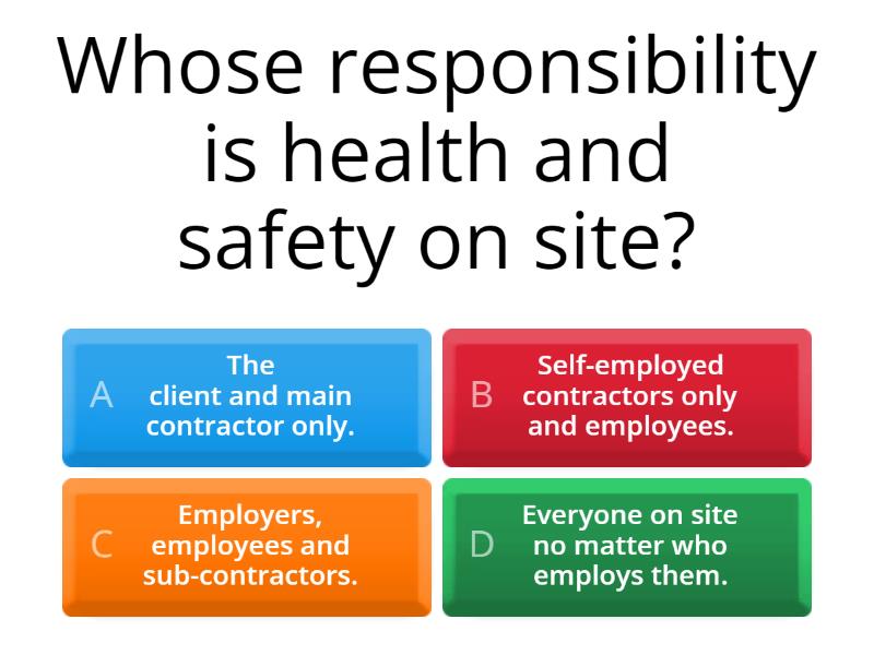 1) Whose responsibility is health and safety on site? a) The client and main contractor only. b) Self-employed contractors only and employees. c) Employers, employees and sub-contractors. d) Everyone on site no matter who employs them. 2) Accidents are best prevented by: a) The Health and Safety Executive. b) Employers inspecting workplaces. c) People being aware of hazards and working in a safe manner. d) d) The site manager. 3) The Health and Safety at Work Act requires employers to provide what for their employees? a) Payment for work. b) Tea breaks in the day. c) A safe place of work. d) Transport to work. 4) Who would you expect to carry out a risk assessment on your site? a) A competent person. b) A police officer. c) A HSE inspector. d) The person who owns the site. 5) If you find an unmarked bottle containing an unknown substance, you should: a) Smell it to see what it is. b) Put it in the bin to get rid of it. c) Put it in the site store out of harm’s way. d) Report it to your site supervisor. 6) Which of the following does not cause skin problems? a) Asbestos. b) Bitumen. c) Epoxy resins. d) Solvents. 7) What would be placed between the two leaves of blockwork in footings before backfilling takes place? a) Insulation b) Lean mix concrete c) Mortar d) It is left hollow 8) Before beginning a welding or soldering task, you must ensure you have a: a) Bucket of water b) Red coded fire extinguisher c) General work permit d) Hot works permit 9) Legislation which governs safe lifting is known as the: a) Health & Safety at Work Act b) Manual Handling Operation's Regs c) Control of Substances Hazardous to Health d) The Lifting Operations and Lifting Equipment Regs 10) Who would prepare the specification for a construction project? a) Site Manager b) Section foreman c) Architect d) Health and Safety Executive 11) What direction is indicated on a site plan or block plan drawings? a) North b) East c) West d) South 12) How many sides does a meter cube have? a) 4 b) 8 c) 6 d) 1 13) Weep holes are provided in retaining walls. a) To drain off the water from the earth b) To ventilate the stone masonry c) To add architectural beauty d) To increase compaction of the earth retained 14) To construct a 100 mm thick partition wall, you will prefer which bond? a) English bond b) Flemish bond c) Header bond d) Stretcher bond 15) A slump test for concrete is carried out, to determine? a) Strength b) Durability c) Workability d) Water content 16) Which of the following types of concrete is normally made off-site? a) Reinforced Concrete. b) Lightweight Concrete. c) High-Strength Concrete. d) High-Performance Concrete. e) Precast Concrete. 17) The legislation covering the reporting of dangerous occurrences, injuries and diseases is: a) Control of Substances Hazardous to Health regs b) Health and Safety at Work Act c) Reporting of Injuries, Disease and Dangerous Occurren d) Manual Handling Operations Regulations 18) The legislation that deal with harmful substances on site is: a) COSSH Regulations b) HSE c) PUWER regulations d) WAH regulations 19) How long will it take for the concrete to achieve 100% of its strength? a) 7 days b) 14 days c) 21 days d) 28 days 20) What practice would reduce the risk of fire? a) Not keeping the site tidy b) Good house keeping c) Keeping all waste in the same skip d) Keeping a fire extinguisher with you at all times 21) What is the area of this measurement, 2.1m x 2.4m = ?  a) 5.98 m b) 5.6 m c) 5.04 m d) 5.89 m 22) What is the area of this measurement, 0.9m x 2.7m = a) 2.45 m b) 3.6 m c) 2.43 m d) 3.36 m 23) What is the area of this measurement, 2.4m x 2.6m = a) 6.24m b) 4.6m c) 4.64 d) 6.43 24) What is the calculation of 150 tiles + 5% for wastage? a) 160 tiles b) 158 tiles c) 155 tiles d) 162 tiles 25) Increase 34 m by 17.5 % a) 38 m b) 39.95 m c) 37.75 m d) 37.95 m 26) If you came across an injury on site, what is the first thing you should do a) Tell the casualty to visit their doctor b) Inform the HSE c) Contact a first aider d) Try and find out what happened 27) Why may a confined space be dangerous to work in? a) There may not be sufficient working space b) Air in the space may be unbreathable due to poisonous gas c) Temperature and poor ventilation may affect the worker d) All of the hazards mentioned 28) Why may young people be more at risk on site? a) There is no specific legislation applying to them b) They are usually left to work alone to gain experience c) There is no requirement to provide PPE to young people d) They're inexperienced and may not recognise danger 29) Where can you find information about hazardous substances? a) Your contract of employment b) The COSHH assessment c) Your HSE poster d) Your time sheet